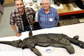 Jonah FisherEnvironment correspondentDean LomaxIchthyosaur experts Dr Dean Lomax and Professor Judy Massare…